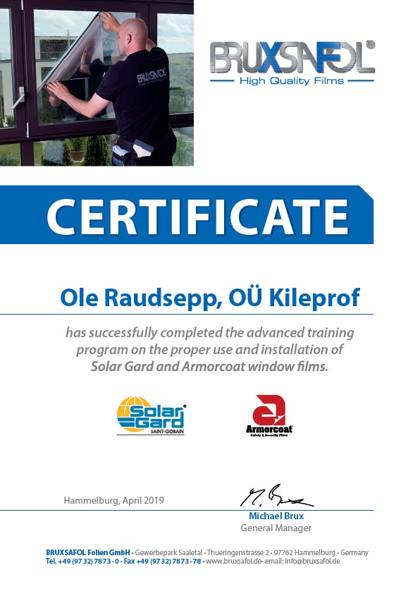 Kiletasime kaatri kõik klaasid, kasutades esiklaasidel Gal50 kilet ja tagaosas Per15 kilet. Nii sai kogu klaaspind ühtlaselt kaetud, kuid erineva tooniga vastavalt klaasi asukohale.