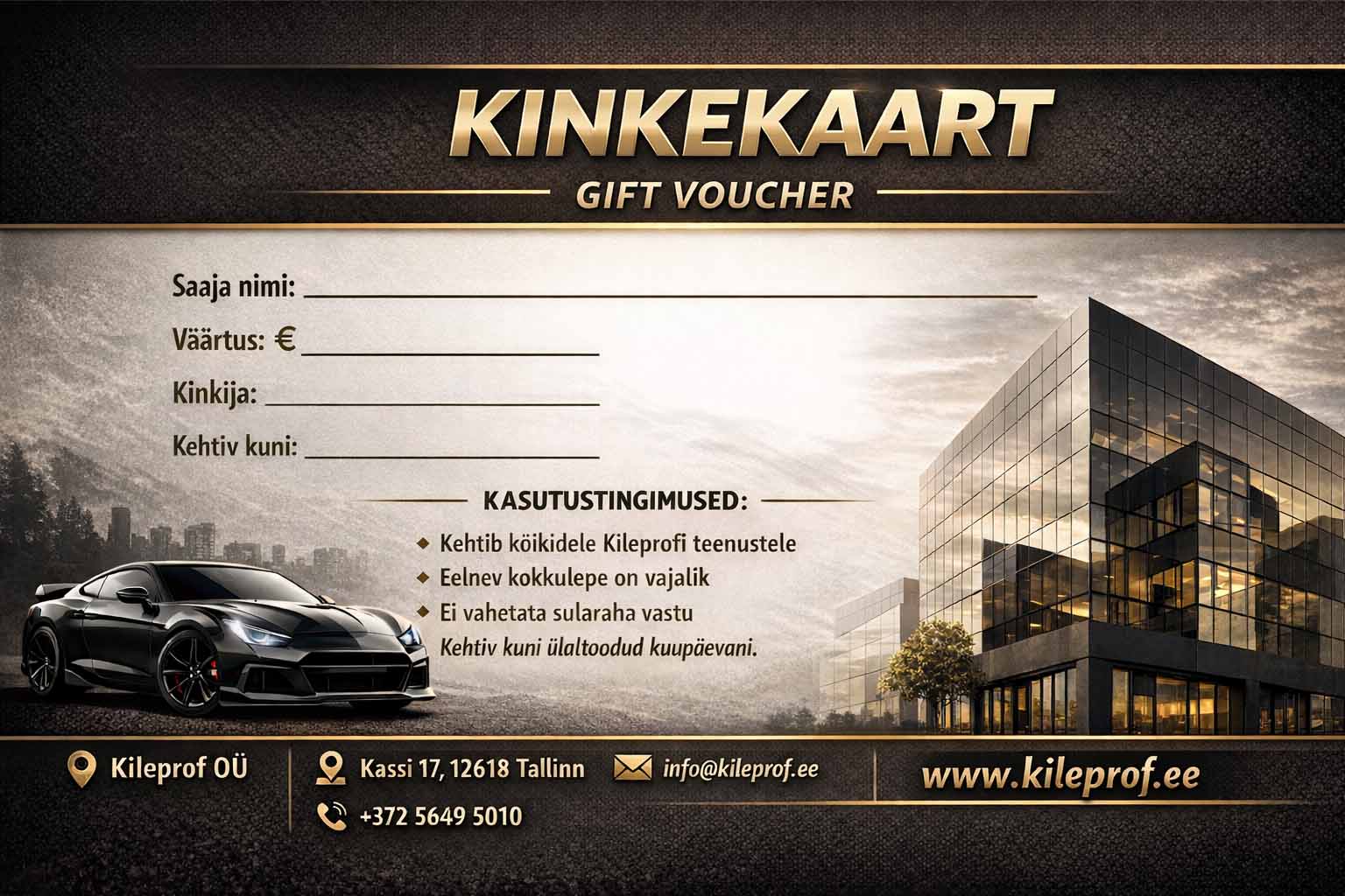 Kileprofi kinkekaart sobib ideaalselt nii autohuvilisele kui ka neile, kes hindavad oma vara kaitset ja esinduslikku välimust.