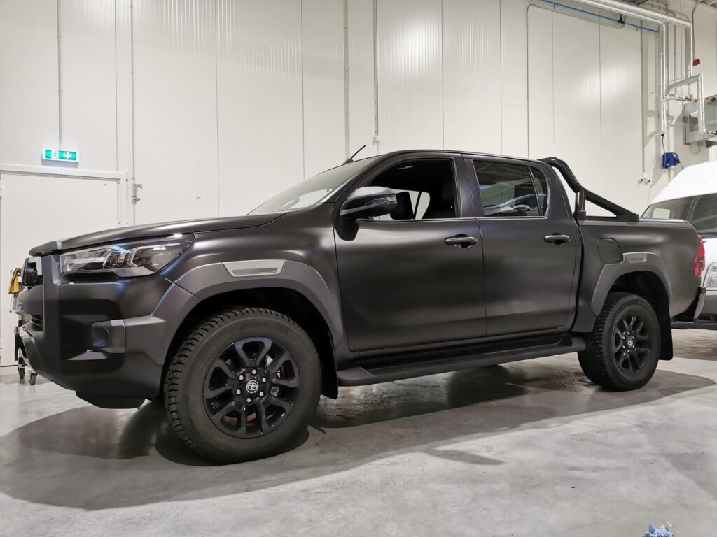 Selle Toyota Hiluxi puhul oli eesmärk anda autole välimus, mis sobiks paremini tema otstarbega. Jahiautoks soetatud oranž Hilux vajas diskreetsemat ja praktilisemat lahendust, mis toimiks hästi nii looduses liikumisel kui ka igapäevases kasutuses. Täiskere kiletamine on sellistes projektides väga hea valik, sest see võimaldab muuta auto ilmet terviklikult ja kiiresti, ilma et oleks vaja minna värvitööde teed.